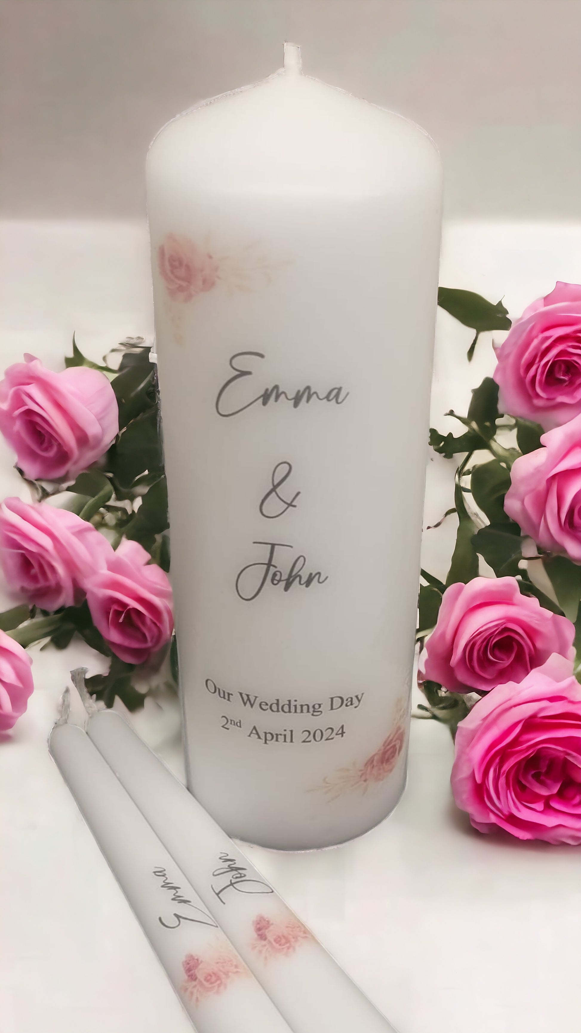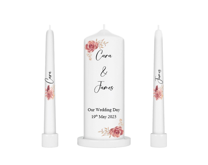 This Boho Rose wedding candle unity set is the perfect addition to your special day. Featuring a 20cm pillar candle and two 25cm long taper candles, you can create a meaningful display that will light up your ceremony and reception. Enjoy this beautiful and timeless tradition of candle unity!
