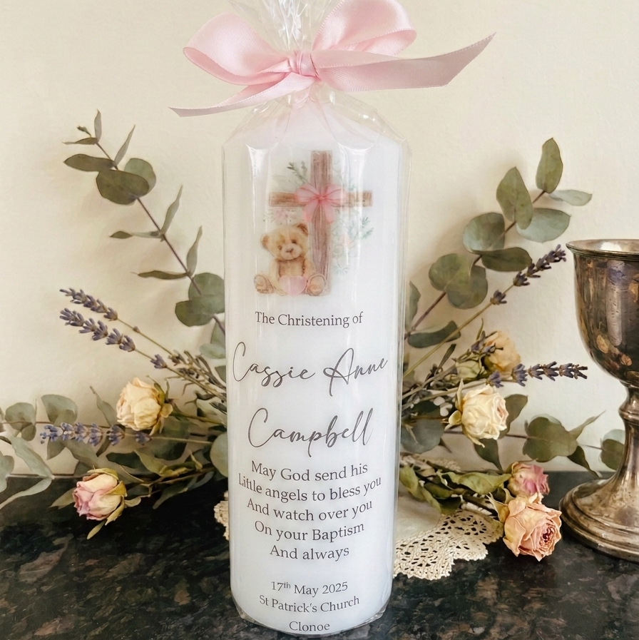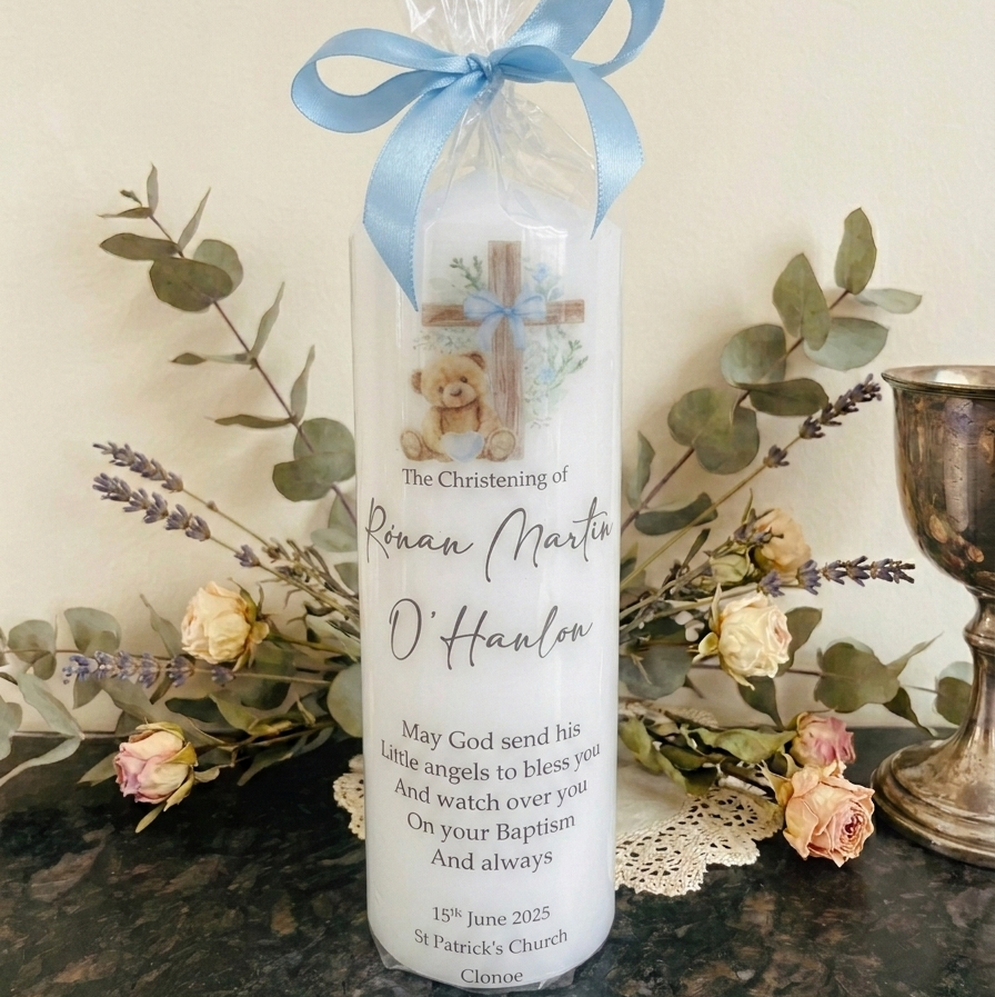 Celebrate this special milestone with our Teddy and Cross Christening Candle. Standing at 20cm tall, this elegant pillar candle makes a meaningful keepsake for the occasion. Beautifully crafted with thoughtful design, it's perfect for creating a warm, memorable atmosphere. A timeless gift that honours the significance of the day.